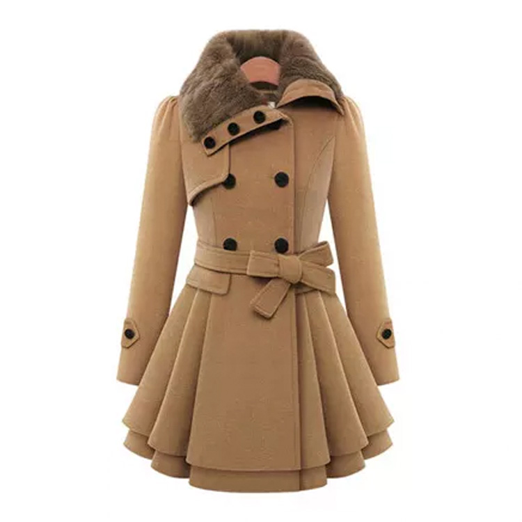 Women’s Warm Faux Fur Collar Wool Long Coat Khaki