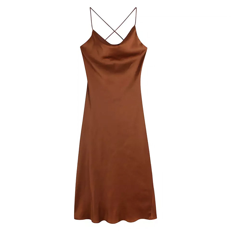 Women’s Suspenders Open Back Satin Long Dress Brown